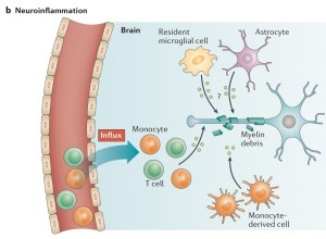 In Neuroinflammatory diseases, such as Multiple Sclerosis, Meningitis and Encephalitis, the white blood cells from the blood stream break through the blood-brain barrier, and they start spreading their cytokines into the brain. The cytokines produced by these external cells throw the equivalent of petrol onto a brain fire.